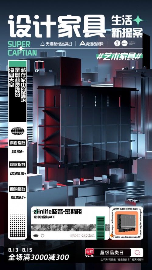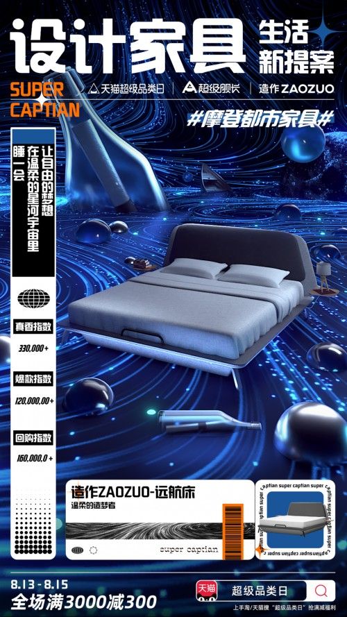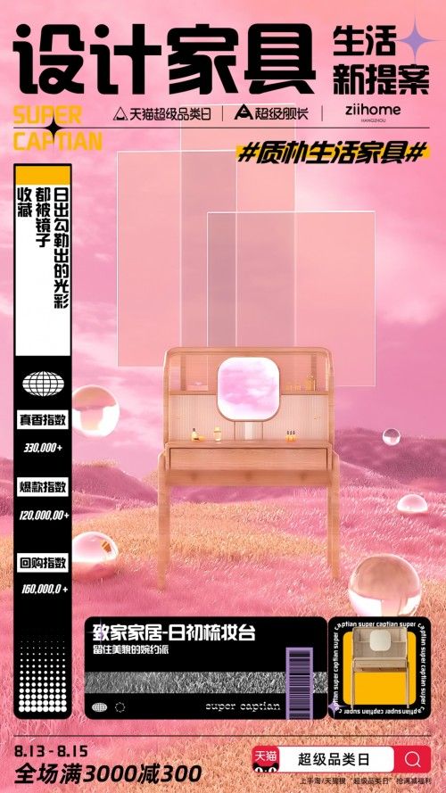这一回,天猫超级品类日明确针对原创设计家具品类提出“生活新提案”,也正是基于这样的大数据洞察,针对年轻消费群体的家具消费喜好,重构消费者在设计家具品类的消费认知,强化他们对原创设计、国产厂牌、艺术性等方面的兴趣,并引导消费者根据个人生活风格,结合质朴生活、摩登都市、艺术等不同消费趋势,选择最适合自己个性化需求的家具产品。
