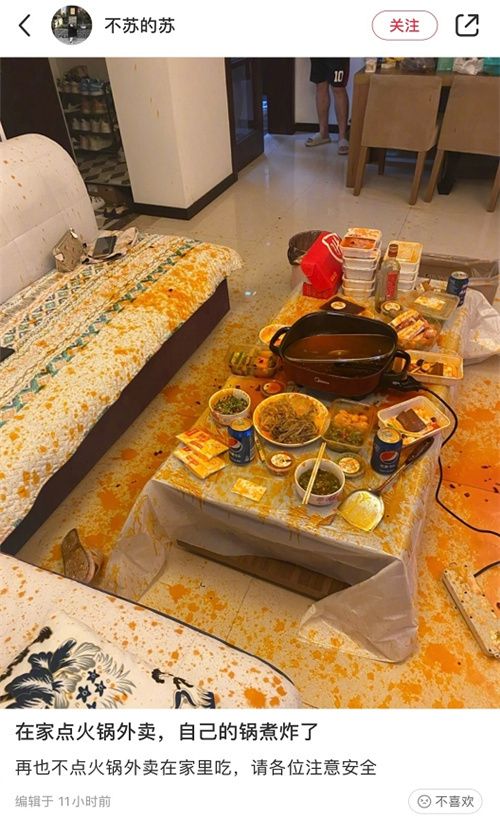 近日,#在家尽量别吃红油火锅#话题冲上微博热搜,点开一看令人咋舌,原来是一位网友在家自己煮红油火锅,结果发生了爆炸。从图片看一片狼藉,红油溅的到处都是,沙发上、餐桌上、白墙上都被染得橙黄。物品损失事小,高温的红油溅到人体上事大,可能一不小心就会烫伤。很多网友看完纷纷表示,再也不敢在家里吃火锅了。