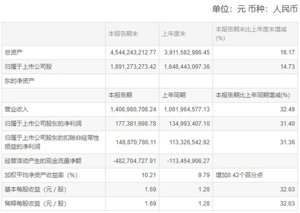 公告显示,报告期内公司实现营业收入约14.07亿元,同比增加32.49%;归属于上市公司股东的净利润盈利约1.77亿元,同比增加31.4%;基本每股收益盈利1.69元,同比增加32.03%。