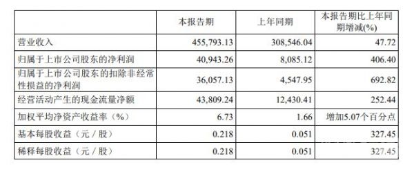 8月13日晚,科达制造股份有限公司(简称:科达制造 600499.SH)公布了2021年半年度报告。报告期内,科达制造实现营业收入45.58亿元,同比增长47.72%;实现归母净利润4.09亿元,同比增长406.40%;实现扣非净利润同比增长692.82%,达到3.61亿元;基本每股收益0.218元/股,同比增长327.45%。