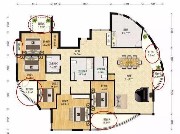 买房前问业主:这套房子带阳台吗?销售人员:带阳台的,基本上都是开发商赠送的哦!等到业主喜滋滋拿到户型图,一看傻眼了,260㎡的房子,全屋却有9个阳台,5个阳台+4个设备阳台,这样的户型到底是好还是不好呢?