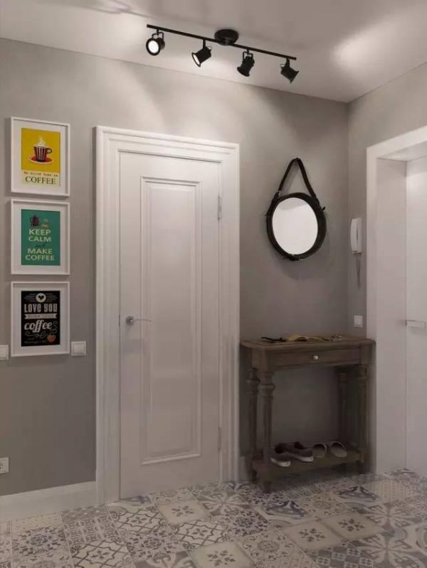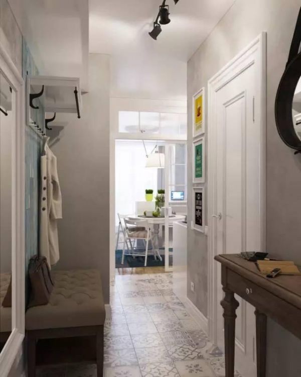 步入玄关的第一眼,就有温馨的北欧风氛围。设计师在靠墙处,加入了一组欧式风的二手柜子,当作放置钥匙的小案几。而满地板上的花砖,让素雅的小屋子,多了一份艺术氛围。
