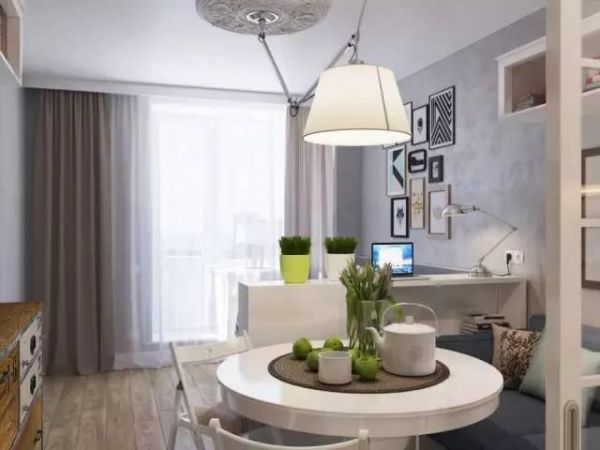 而客厅与餐厅,进行了一体式的设计,一组灰蓝色的沙发+可收式的圆餐桌,组成了一个小小的客厅空间,在仅有几㎡的空间里,这样的客餐厅显得狭窄拥挤,但是一个人住,的确足够了。