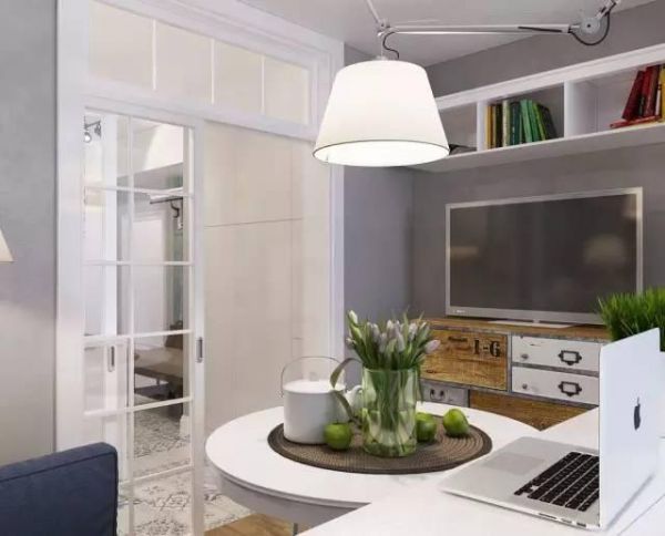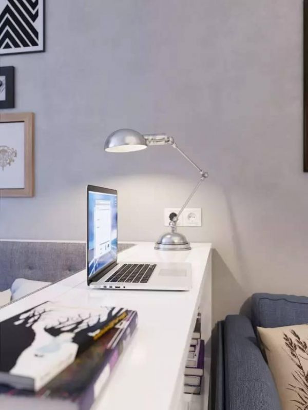 而小床与客厅之间的柜子,既是一个隔断,也是一个小小的书桌,可以坐在沙发上,打开台灯,在小小的空间之中,加班看书,或者观影,都显得特别惬意。
