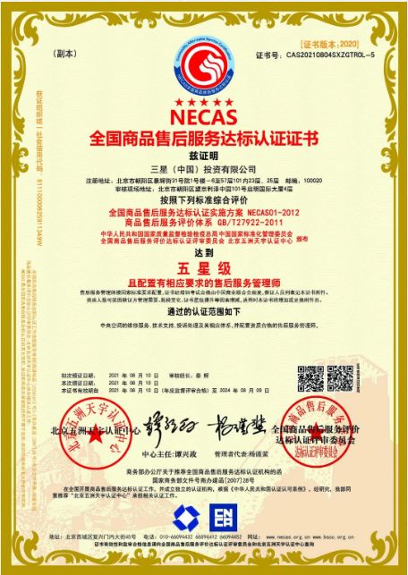 NECAS全国商品售后服务评价体系是国家质检总局、国家标准化管理委员会颁布的关于商品售后服务的评价标准,该认证用于客观反应企业售后服务工作的现实状况,准确衡量企业售后服务的实际水平。三星中央空调获得五星级认证,证明在服务规章制度、服务实力、服务水平上均有实力为用户提供完善的售后服务。