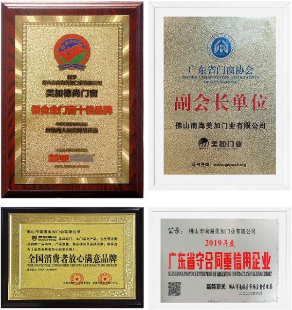 在砥砺中奋进,在跨越中腾飞。品牌荣誉至上,美加德尚门窗荣获"广东省守合同重信用企业"、"广东省门窗协会副会长单位"、"中国门业行业十大品牌"、"铝合金门窗十佳品牌"、"全国消费者放心满意品牌"等荣誉,体现了全国经销商、行业媒体以及消费者对美加德尚门窗品牌服务的高度认可,更是对美加德尚门窗16年来不懈努力的肯定。