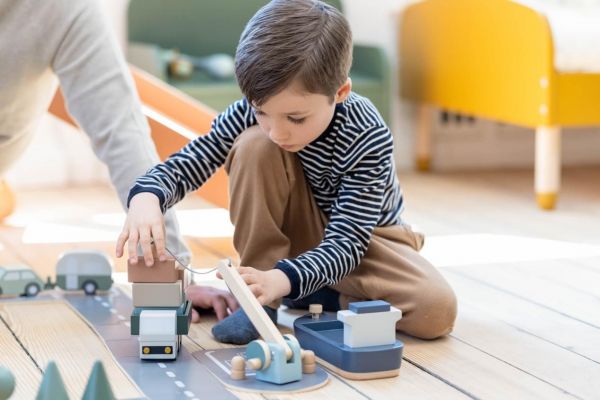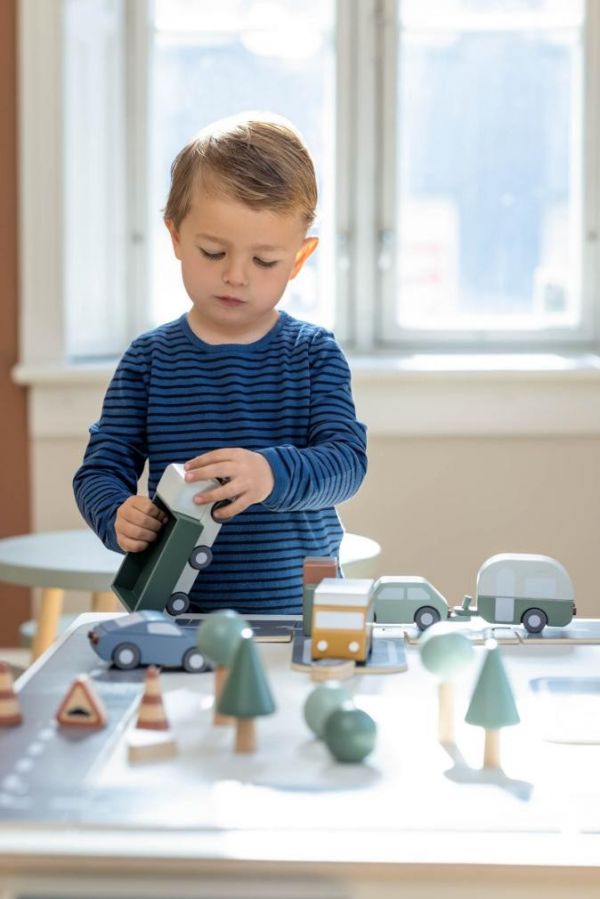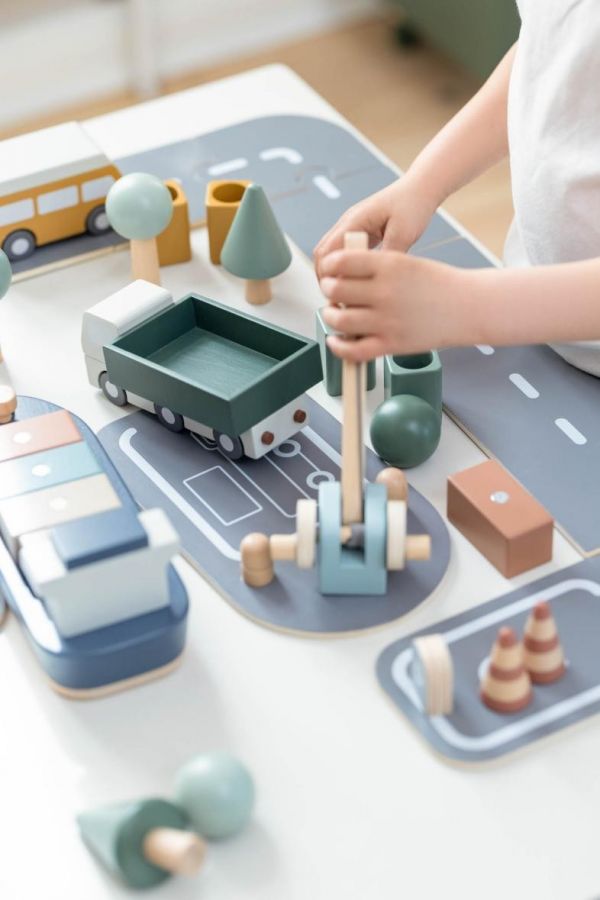 FLEXA/芙莱莎儿童家具的这套轨道车玩具有十分多样的组件。汽车组件中包括四台复古的木制汽车:跑车、面包车、汽车和大篷车。这些都可以帮助孩子提高精细运动技能。马路组件由双面打印的轨道碎片组成,孩子可以轻松构建一条又长又直的公路、盘山公路、或矩形的轨道。马路配件包含微型树木、灌木丛、交通锥和路标,可以完美地作为玩具马路的补充。卡车木质玩具可以让孩子模拟废品回收,配备了车辆、垃圾箱、容器和吊车组件。集装箱货轮玩具则配备了几个颜色不同的集装箱和回收箱。以上这个组件可以独立也可以互相搭配玩耍,给孩子不同的玩耍乐趣。