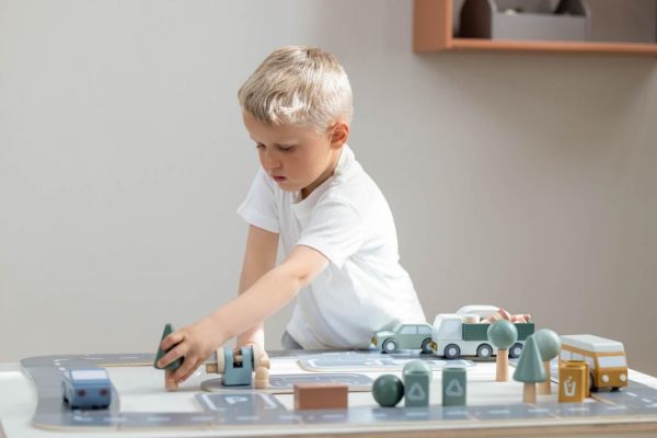 对于5岁以上的儿童而言,他们已经有了一定的逻辑思维能力,对序列、增加、减少有了初步的认知。此时他们会利用FLEXA/芙莱莎儿童家具的轨道车玩具来对场景进行设计。他们会先构想出一个整体结构设计,然后有计划地组合,最后再用马路组件装饰自己完成的作品。
