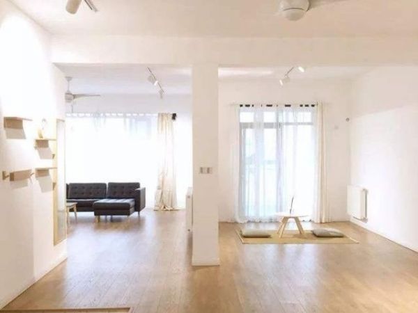 正对大门的玄关门厅,空无一物。左侧就是客厅和茶室,全屋都是白墙,几乎没有吊顶,地面铺的都是环保的木地板。
