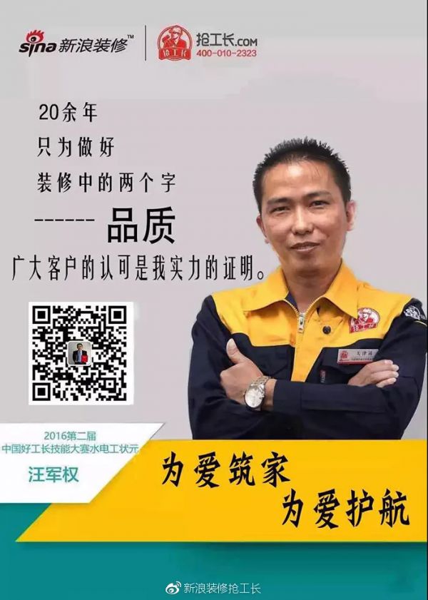 2013年加入抢工长平台,在平台的大力支持和帮助下,进行互联网推广,建立个人网上店铺,个人知名度有了很大的提升,装修事业又上了一个新台阶。经过多年的努力和坚持,汪军权工长现在有着稳定的40余人的精英团队,都是经过考核筛选下来的精工巧匠,本着以质量求生存,以口碑谋发展,坚持做良心工程,坚持走品质路线,弘扬大国工匠精神。