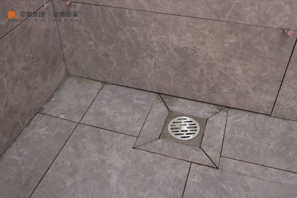 金地新家健康整装采用回八字型工艺,即将地漏四周的瓷砖切割成4个梯形,全部向内倾斜,这样形成四周高,中间低,水就会顺着四周流向中心的地漏。这项工艺难点在于4块梯形瓷砖的切割必须平整,组合起来严丝合缝,这非常考验师傅的手艺。