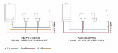 由于零冷水本身的特殊性,其安装要求有别于其他热水器。比如大多数零冷水热水器要求安装回水管,如果不安装回水管,零冷水热水器的洗浴体验会变得糟。而能率S2系列零冷水燃气热水器考虑到所有用户的需求,适合每一个家庭,无论新居旧宅,有无回水管,皆可安装。如果是老房换新,没办法提前铺设无回水管,只需要在最远端的出水点安装单向H阀,将冷热管道连接,借用冷水管作为回水管,回收冷水进行加热,即可形成热水循环系统。让热水快速抵达全屋各个角落。