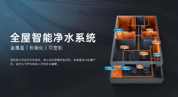 安心加云联依托强大的生态合作体系,从「饮、洗、浴、用」四大维度,提供前置过滤器、中央净水机、中央软水机、多种末端净水器的全系列水处理产品,打造覆盖入户、客厅、餐厅、厨房、浴室、阳台等场景,全方位满足人们的用水需求。