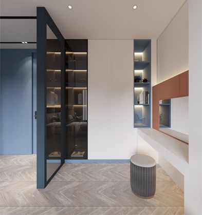 打开家门,步入玄关空间。首先映入眼帘的是蓝橙互补色的对开门隐藏柜,整块的门板与护墙板和谐统一,营造出整合划一的空间感。海量的收纳空间帮忙理清生活的琐碎,一推开柜门就能看见的蓝橙互补色将成为你对家重要的记忆点,日复一日,第一眼就能得到的视觉刺激将下意识的安抚你忙碌的心灵。嘿,到家了,一切烦恼请寄存在门外,生活的压力明日再继续。