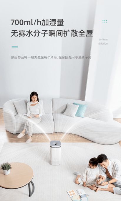 而且加湿量高达700ml/h,无雾水分子可扩散至全屋,像美妙音符一样充盈在每个角落,随处可享清新净润。恒定的水雾均匀覆盖全屋,让体验不留遗憾。