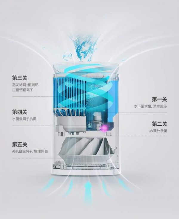 五重水质净化技术,层层过滤,加湿更放心。净水滤网粗过滤,拦截水中的颗粒物杂质;UV紫外强效杀菌,除菌率高达百分之99%;蒸发滤网+阻隔环双阻拦,拦截钙镁离子杜绝白粉污染;银离子抗菌材料持续抑菌;关机自启风干滤网,滤网干燥不发臭,就像拧干毛巾一样,物理抑菌不给细菌留机会。