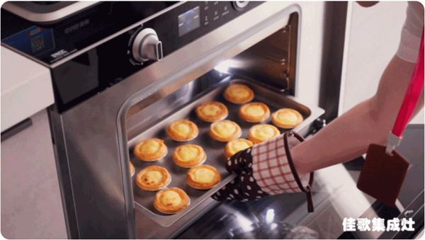 佳歌蒸烤一体集成灶集成专业烤箱,烤蛋挞自然不在话下。上下双层电热管加热,上置循环风机循环导流热气,3D热风立体烤制,蛋挞出炉表皮酥脆不焦,内里嫩滑软糯,一下子就能吃掉好几个!