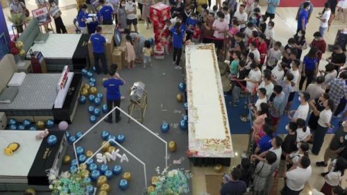 8月15日周日下午,星艺佳盈锋商场举行了盛大的切蛋糕仪式,现场准备了5米长的大蛋糕,吸引了众多市民前来参观。