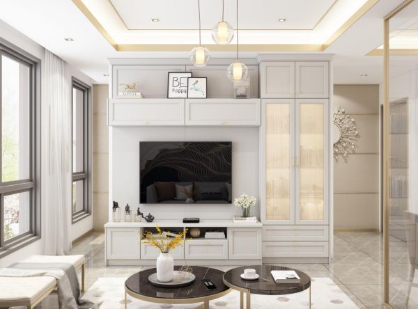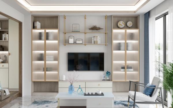 半开放式的设计能让整体空间看起来更轻盈,再搭配玻璃柜门,通透又高级。电视机可以居中内嵌,保证观影效果,让整体布局对称而不呆板。
