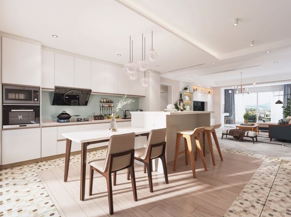 小户型如果是沿用传统厨房的设计模式,用实体墙把客厅和餐厅划分开,那房间会显得更狭小压抑,而且厨房使用时空间也比较局促。