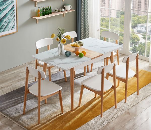 这款餐桌的台面采用耐磨耐划耐高温的岩板制成,而且可以伸缩,平时就是个小方桌,能满足2~4人用餐,展开变长桌,能同时容纳6到8人,再也不用担心亲戚朋友来玩,吃饭时候坐不下啦。