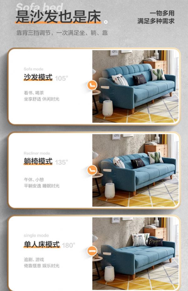 这款两用沙发床可谓是小户型客厅的救星,身姿小巧不占空间,有三种模式可以满足多种需求。白天,它是可以舒适倚靠的沙发,看书、喝茶坐享休闲时光;晚上,它能变身成为柔软舒适的床,安逸平躺,守护美梦~