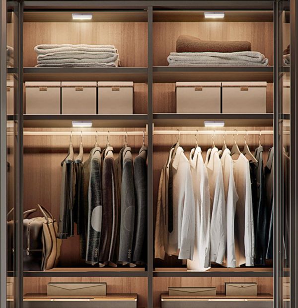 有些家庭有独立的衣帽间或者衣柜做地比较大,大衣柜虽然储物空间充足,但也可能有部分区域不能被灯光照到,成为照明盲区,想找个衣服都看不清。在衣柜内部装上感应灯,开门时自动照明,方便实用。