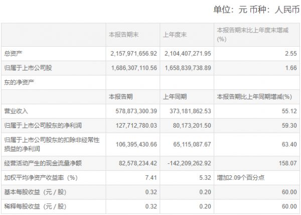 公告显示,报告期内广东好太太科技集团股份有限公司实现营业收入约5.79亿元,同比增长55.12%;归属于上市公司股东的净利润约1.28亿元,同比增长59.30%;归属于上市公司股东的扣除非经常性损益的净利润约1.06亿元,同比增长63.40%;基本每股收益0.32元。