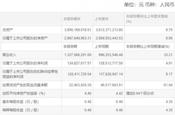 公告显示,报告期内麒盛科技股份有限公司实现营业收入约13.27亿元,同比增加33.21%;归属于上市公司股东的净利润盈利约1.35亿元,同比增加4.91%;基本每股收益盈利0.48元,同比增加4.35%。