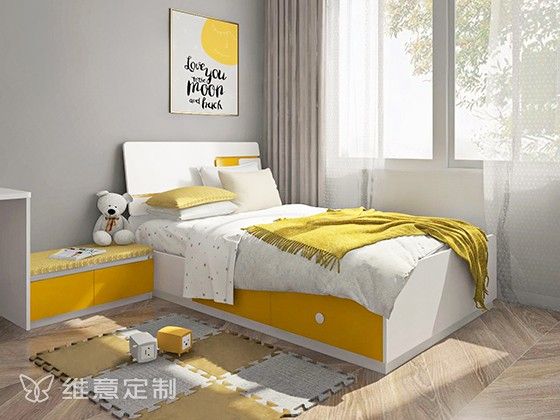 充满活力感的黄色,是小朋友很喜欢的颜色,显得房间温馨又阳光。床的下半部设计成抽屉,放置一些不常用的书包、玩具等物品,也可以用来收纳换季的被褥。床屏造型可更换,方便睡前阅读时倚靠。