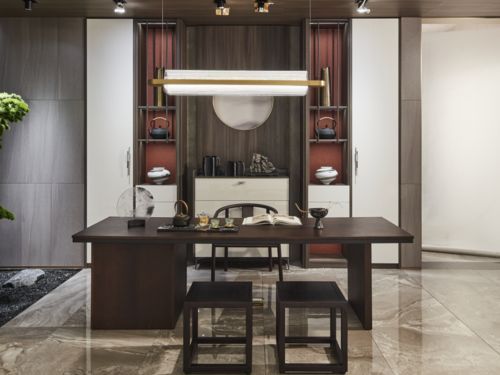“云影东方”系列的餐厅在保留东方元素的同时,又做到了极简时尚。餐边柜上方吊柜采用磨砂玻璃做柜门,再搭配上拥有天然纹理的雾隐金石背板,营造出江南水乡的别样韵味。