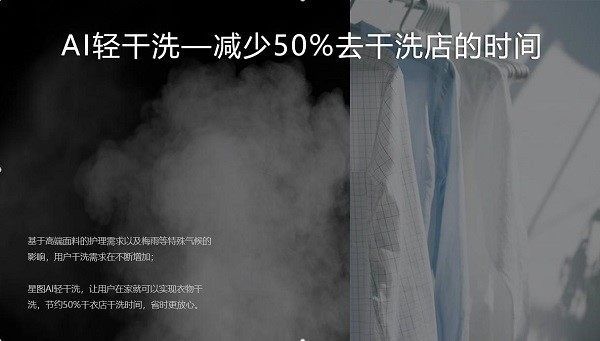 为解除高端用户群体对于衣物护理方面的顾虑,实现高效 “无水去污”功能,COLMO首创推出AI轻干洗技术,利用纳米级高能软蒸汽高速穿透衣物,有效去除常规污渍,还能去除隐藏在衣物纤维处的干燥粉尘类污渍。