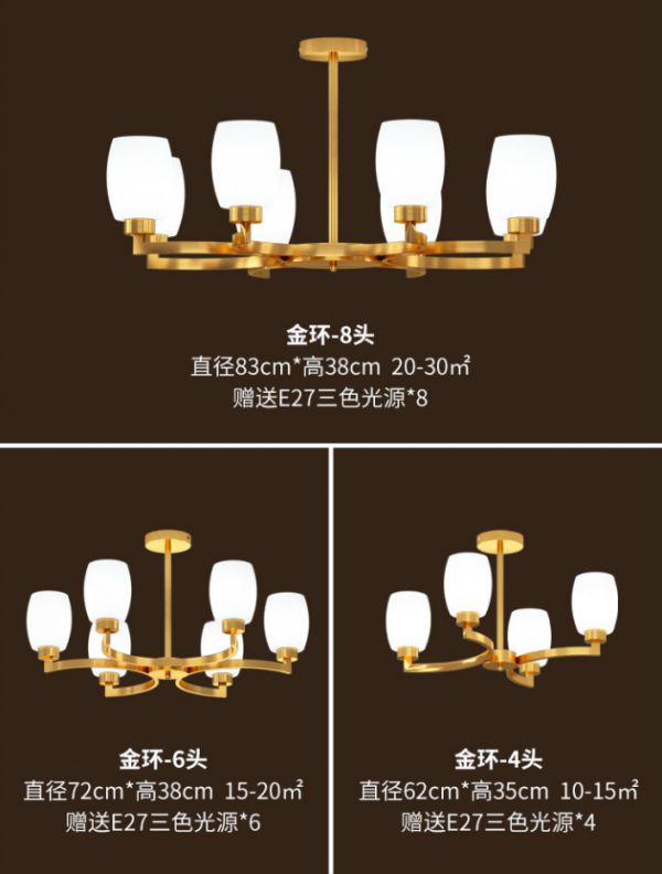 宜美照明金环吊灯附赠宜美照明E27三色光源,可通过开关自由切换3000K、4000K和6000K三种色温,满足不同环境下的灯光需求。