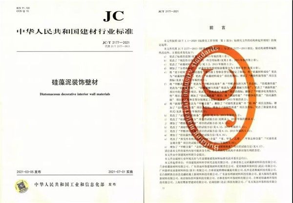 由中国建材总院为主编修订的《硅藻泥装饰壁材》(JC/T 2177-2021)建材行业标准正式实施,该标准归口于环境友好与有益健康建筑材料标委会。