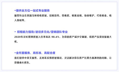 而汉伦基业北京物业管理有限公司就是这样优秀物业管理公司之一。它是北京汉伦管理咨询有限公司的全资子公司之一,拥有10余年的英国本土物业管理经验,有着标准化,精细化的服务体系,也与英国当地多家房产管理中介建立了长期战略合作。作为专业的托管机构,多年来汉伦一直致力于帮助业主进行一站式专业房产托管服务,提供全方位租赁托管服务模式,包括收房验房、维修处理、招租宣传、租客沟通及背景调查、入住前后房屋检查、租客维护、定期发送房屋收支报告等,同时也提供更多的优质增值服务,包括专业报税、处理各类房产涉及的账单等,以更高效、专业、省心的服务态度完成海外房产托管,帮助投资者缩短房屋空置期、节省成本开支以实现最大利益化的投资回报。目前汉伦的业务也已覆盖伦敦、剑桥、牛津、曼切斯特、伯明翰、谢菲尔德、莱斯特、诺丁汉、约克等英国大多数核心主流城市。