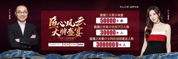 其中,本次中国匠心家装直播节通过金牌、诺贝尔、塞尚印象、卡百利四大品牌的共同努力,斩获颇丰,直播三天累计单量50000+单;直播三天累计在线下订人数30000+人;直播三天累计全网在线观看总人数3000000+人。