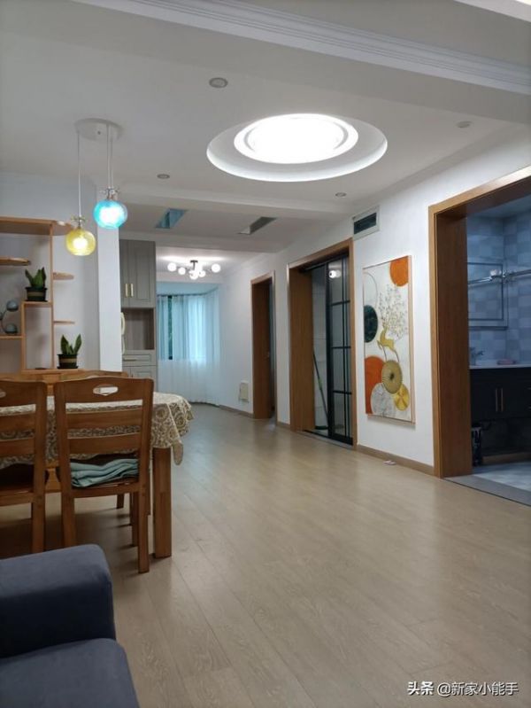 餐厅区域布置了一张方形餐桌,占用的空间大小都位置合适,人多需要挪动位置,方便很多。原木的餐桌椅款式还是蛮不错的,与家里的门套包括卧室门都是原木色,搭配起来比较协调。餐厅顶面安装了圆形吊顶,视觉上很抢眼,打开灯带更有层次感。墙上挂着很漂亮的装饰画,可以起到很好的装饰效果,特别棒。打扫干干净净,可以说地面一点灰尘都没有。
