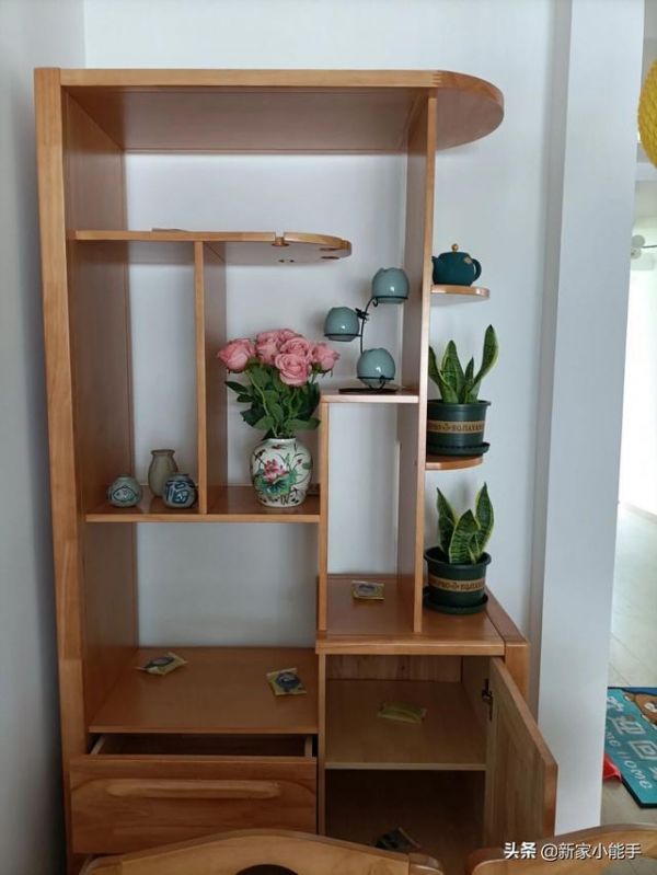 餐厅区域布置了一个隔断柜子,本来当隔断使用,后来布置在这边角落位置刚好合适。如果以后不需要的话,可以搬到其他空间或者直接不要,也不会有任何影响。柜子上可以摆放一些植物或者其他的小物件装饰,可以起到很好的装饰效果,很有艺术气息。