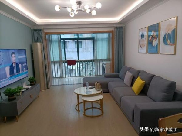 整个空间装修还是比较极简的,客厅电视背景墙没有做其他的造型,直接刷了蓝色的乳胶漆,与其他灰色的墙面形成区别,效果更美,没有做其他的造型,显得更简单,更舒适。电视机直接挂墙上,比放在电视柜安全,更节省空间。右边是沙发茶几区域,布置了“L”字形沙发,坐着很舒服,款式大小位置刚好合适。墙上挂着装饰画,也是蓝色调,搭配起来很协调。客厅阳台作为生活区,可以方便晾晒衣服,不会有任何影响。