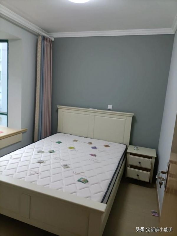 次卧基本也是一样的效果,不过面积上稍微小一些。利用飘窗的位置设计了非常实用的飘窗柜,可以适当增加一些储物空间,还是蛮不错的。一张大床,睡着很舒服。对于卧室来说,都没有安装吊顶,仅仅走了一圈石膏线条,就很舒服了。