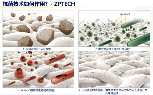 ZPTech®则是一款多功能的吡啶硫酮锌产品,它以液体的形式提供给纺织面料生产商,在织物产品制造过程中直接融入纺织纤维和泡棉,使其成为持久有效的抗菌剂。经大量实验测试,即使经过50次的家庭洗涤,ZPTech®在涤纶和莱卡弹性布料上的细菌、真菌的抑制作用仍达到99.99%。此外,它的热稳定性高达 235°C,可适用于须在高温下进行的多种纺织品染色和浸轧加工工艺。