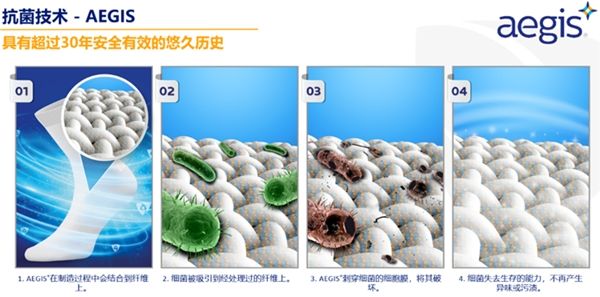 ZPTech®、AEGIS®与Silpure®为妙抗保®内建抗菌技术的代表性解决方案。作为广谱液体抗菌剂,AEGIS®具有阳离子作用模式,在纺织品制造过程之初会与纤维结合。当细菌等微生物与其接触时,AEGIS®能刺穿细菌细胞膜,将其破坏,细菌便失去生存能力,不再产生异味或污渍。