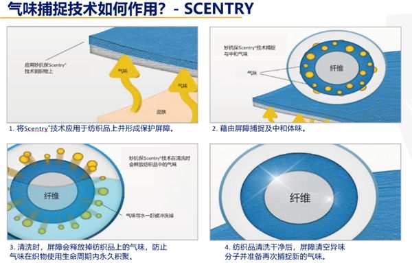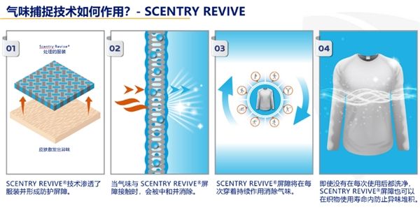 妙抗保®气味捕捉技术则略有不同,通过捕获从外部来源(身体,环境)转移到纺织品上的气味,进行中和。作为气味捕捉技术两项代表性解决方案,SCENTRY®与 SCENTRY REVIVE®并不是抗菌剂。该技术与面料结合并形成防护屏障,一旦异味生成,它能立即将其中和,持续防止产品在使用过程中沾染源于身体和外界的异味,且不需要频繁清洁即可保持产品气味的持久清新。