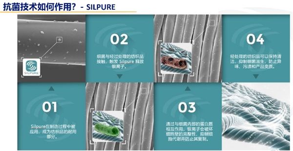 同样,Silpure®也运用于纺织品制造过程中,使其更加耐用。当细菌与经过处理的纺织面料接触时,即触发 Silpure®释放银离子。通过与细菌内部的蛋白质相互作用,银离子会破坏细胞壁的完整性,抑制细胞代谢并防止其复制。经该技术处理过的纺织制品能保持清洁,抑制细菌滋生,防止异味、污渍和产品霉变。