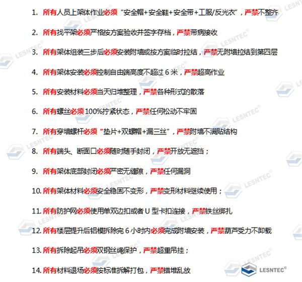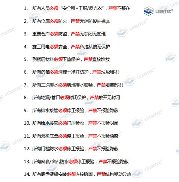 在本次的检查中公司发现部分项目经理未严格按照施工标准执行、未全部落实工序验收等问题!在事后的总结会议上,公司进一步强调了一级执行落实、二级检查监督和三级评价分析的质量安全管理责任体系,重新梳理了爬架和整体卫浴关于质量安全检查评价的底线条例,郑重指出条例里的14条“必须”、“严禁”的内容,并张贴在各个项目上,便于日常监督的同时加深员工对底线条例的理解与认识,建立质量安全生产检查和事故隐患排查的落地机制,保障质量安全管理落到实处!