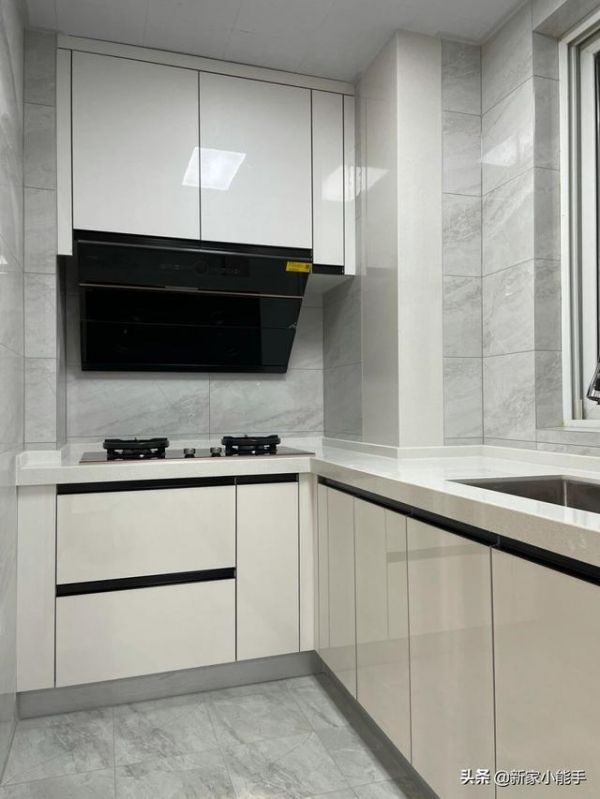 厨房根据结构,定制了“L”字形的橱柜,布局形成了“洗、切、炒”的顺序,大小位置合适,使用到的时候也比较顺手。安装了石英石台面,特别耐脏。地面与墙面都是选择铺贴灰色瓷砖,好看,而且与厨房色调完美搭配。在这样的小小厨房,做饭菜,都很有心情。水槽安装在靠窗位置,洗东西的还是看窗户外面,心情得到适当放松。