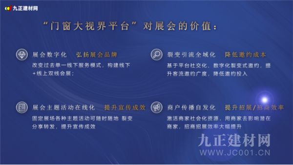 四川省门窗行业协会特联合国内数字化展会平台zui专业的运营机构——九正建材网,打造基于中国(成都)门窗博览会的数字化云展平台——门窗大视界,为展会和展商进行数字化赋能、线上线下双线融合的产业互联网宣传推广和资源对接平台,为会员实现365天高效、便捷的品牌宣传、招商加盟、上下游供应链采购撮合。