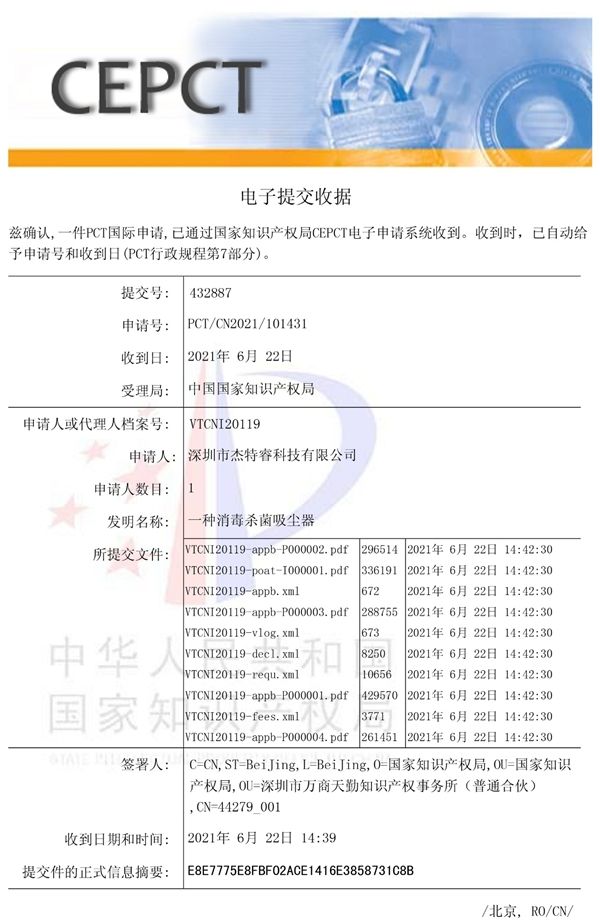 (“一种消毒杀菌吸尘器”已被提交为PCT国际发明专利)