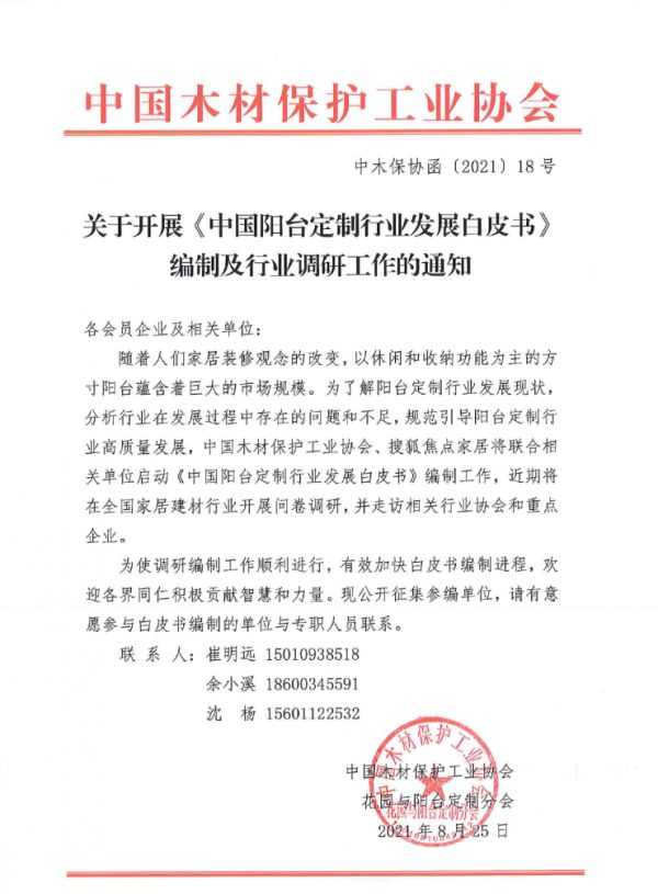 为了解阳台定制行业发展现状,分析行业在发展过程中存在的问题和不足,规范引导阳台定制行业高质量发展,中国木材保护工业协会、搜狐焦点家居联合相关单位正式启动《中国阳台定制行业发展白皮书》编制工作,近期将在全国家居建材行业开展问卷调研,并走访相关行业协会和重点企业。