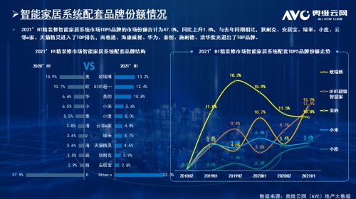 随着5G、人工智能、物联网等技术的快速发展,智能家居市场迈入快速发展车道,尤其是在全国各地区房地产精装政策不断下发的态势下,智能家居已成为赋能房地产转型升级的重要助力。根据近日奥维云网发布的2021年度上半年地产大数据报告显示,今年上半年精装修开盘楼盘项目个数1490个,同比下降8.9%;精装套数123.75万套,同比下降12.0%,而与之相反的是,精装修市场智能家居系统配套项目个数124个,同比上升31.9%;配套规模为9.44万套,同比上升43.9% ,据此不难看出2021年精装智能家居市场发展势能的迅猛。